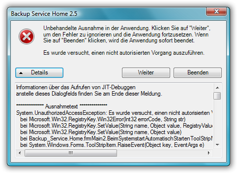 Hallo, wenn ich versuche den Autostart einzustellen, erscheint eine Fehlermeldung welche über Fehlende Rechte klagt. Ich denke mal, dass du den Autostart im HKEY_LOCAL_MACHINE Key der Registry setzen willst, dies benötigt aber unter Windows Vista Administratorrechte. Könntest du es in einer nächsten Version evtl. versuchen in den HKEY_CURRENT_USER zu schreiben?